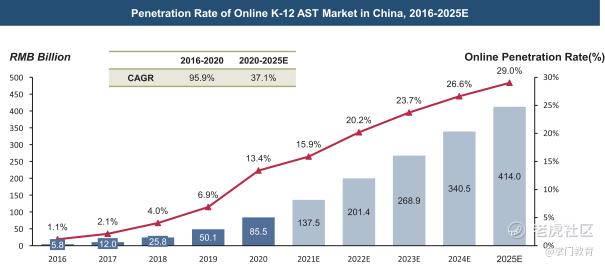 中国拥有世界上最大的在线教育市场,近年来在线K-12课后辅导市场规模一直保持稳步增长。Frost & Sullivan报告显示,按总费用计,中国在线K-12课后辅导市场从2016年的58亿元增长至2020年的855亿元。复合年增长率为95.9%。预计2025年将达到4140亿元,复合年增长率为37.1%。