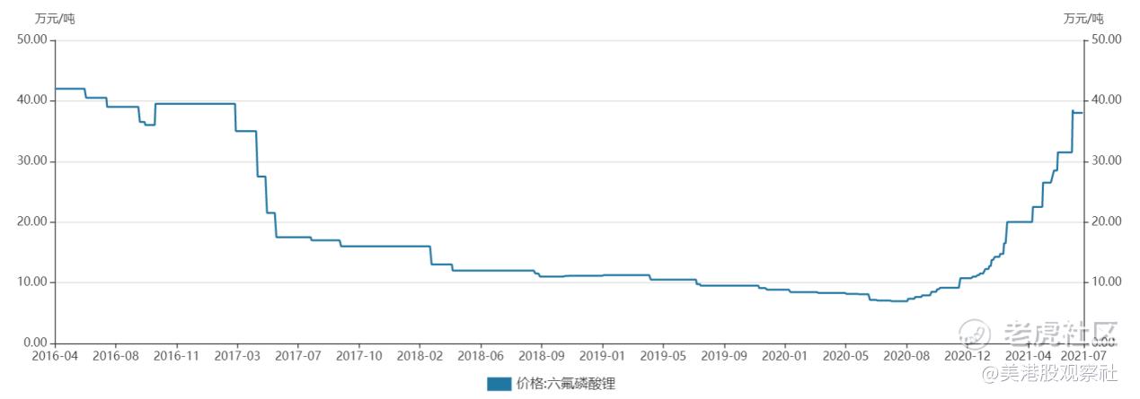 六氟磷酸锂供给更为紧张,新产能主要为天赐材料、多氟多等,且要等到明年才能放量。目前六氟磷酸锂的价格已经从年初的11万猛增到目前的38万/吨,而且涨势依然不减。根据各公司的投产计划,新增产能预计要到22年下半年才能达产。下半年旺季下,六氟磷酸锂的行情预计还将持续。