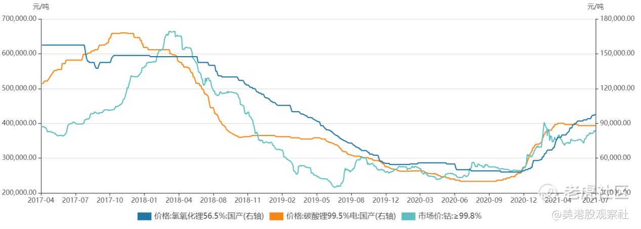 受高镍三元电池需求增加影响,氢氧化锂价格近期要比碳酸锂更为强势。