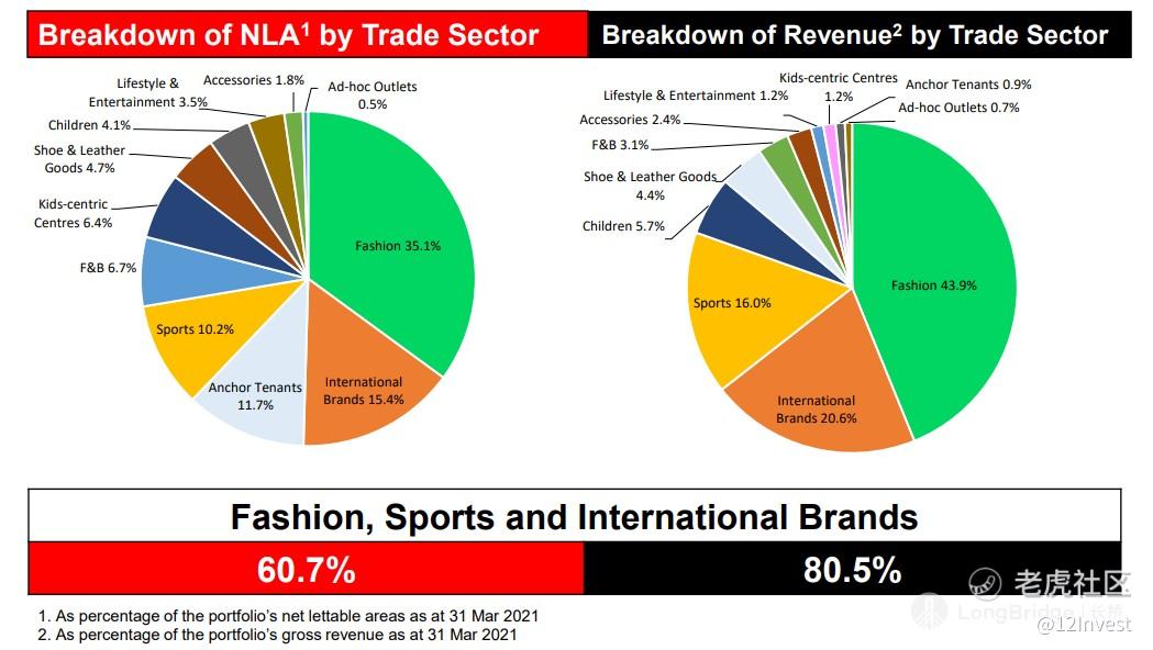 以旗下的租户的组合来看,我们看到时装占了最大的比例。如同公司在图中显示的一样;时装、运动类服装以及国际品牌供占了 80.5% 的 2021 年第一季度的营业额,可见公司对于这方面有多看中。