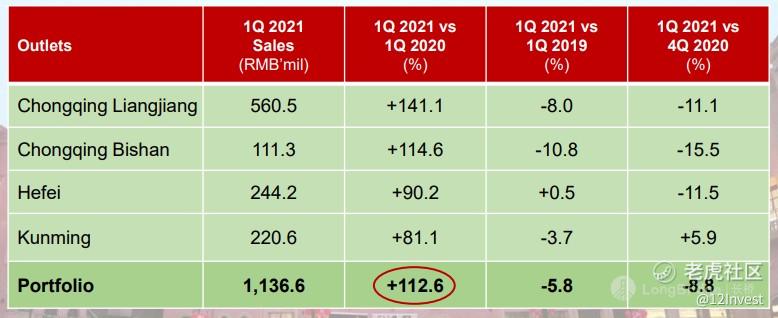 另外,公司也提供了较为相信的直销购物中心的销售数据。我们知道中国在去年的第一季度被疫情影响,因此零售业务也肯定会被打击。那么公司在今年对比 2020 年第一季度而言的,销售量增加了 112.6%,但对比疫情前的 2019 年第一季度仍然下跌了 5.8%。因此,可见公司还未完全恢复到巅峰的状态。若是我们将之与 2020 年第四季度比较的话,销售额则是下降了 8.8%。
