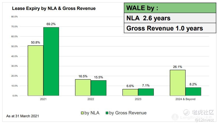 基本上,公司的整个产业组合都相对的稳定;其出租率目前为 93.5%。至于 WALE 而言,公司的 WALE 虽然只有 2.6 年,但是管理层却曾经提到这是为了最优化租客组合的一种做法,而以毛收入来看,2021 年终预计有 69.2% 的租约会到期。因此管理层是否能更新租约或寻找新的租户就成了非常关键的一个参考数据了。