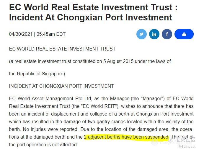 但需要提到的是,公司的 Chongxian Port Investment 出现了泊位的崩塌;但所幸的是并没有任何的人员伤亡。目前在 2 个泊位中的运作暂时被停缓,实际对于公司的业绩明显还不确定,未来 $运通网城.SG 会再给公司一些更新。