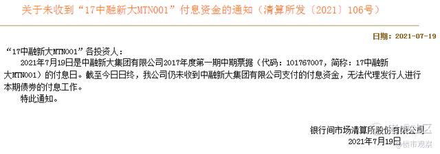 上海清算所亦公告显示,中融新大未能按照约定将“17中融新大MTN001”付息资金按时足额划至托管机构,已构成实质违约。