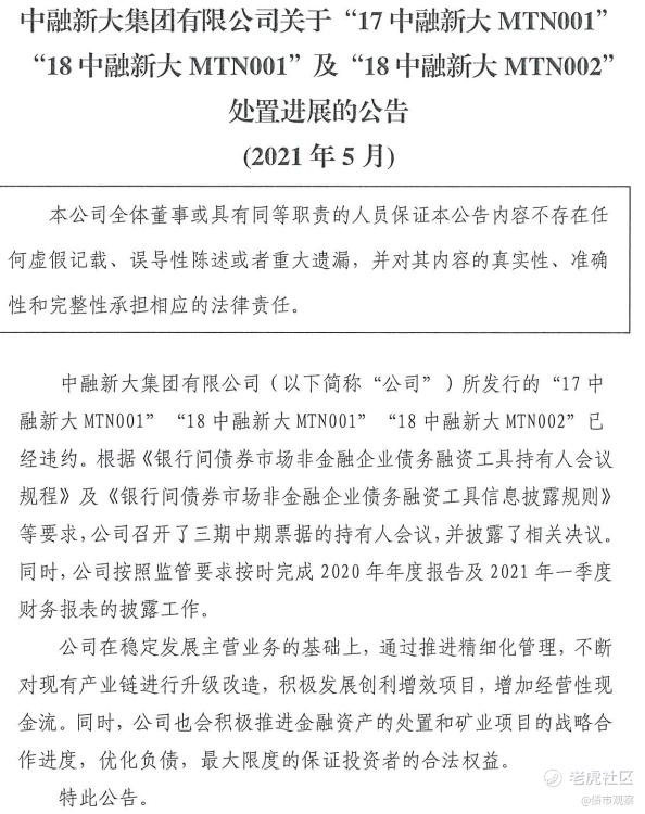 图片来源:《中融新大集团有限公司关于“17中融新大MTN001”、“18中融新大MTN001”及“18中融新大MTN002”处置进展公告(2021年5月)》