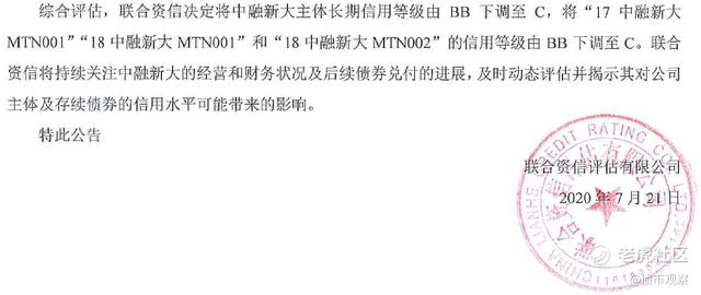 2020年4至7月,联合资信评估有限公司(下称:联合资信)三度下调中融新大及其债券的信用评级至C级,C级是指中融新大不能偿还债务。