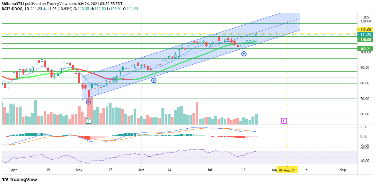 $DDOG has experienced some roller coaster this year but at the moment this roller coaster is on the way up nicely within the channel. No reason to bet against it. Facing some resistance at $112 but the trend should be able to bring them thru. However please be prepared if it breaks below this channel, this roller coaster could be on the way down fast. Be careful, lock in your profits along the way and good luck!