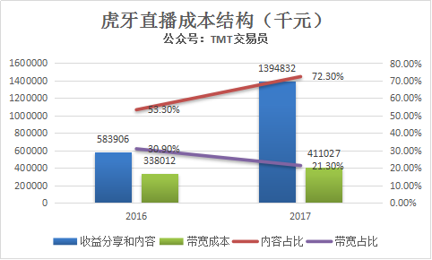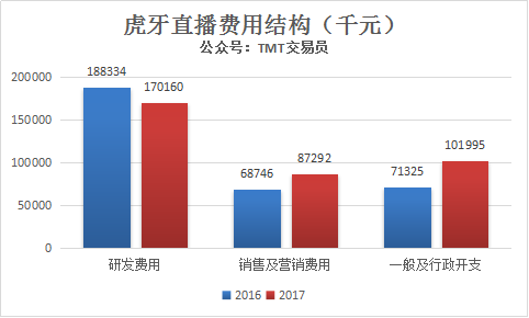 虎牙直播成本是收益共享和内容成本、带宽成本,2017年,收益共享和内容成本为13.95亿元,占总营收比重达到72.3%,与2016年的53.3%相比有较大幅度提升。2017虎牙带宽成本为4.11亿元,占总营收21.3%,比例有所下降。主要由于2017年虎牙开始运用云计算技术降低了带宽成本。
