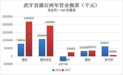 虎牙2017年营收达到21.85亿元,毛利2.55亿元,净亏损8096.8万元。2016年,虎牙直播营收7.97亿元,净亏损6.26亿元。相比于2016年,虎牙直播营收大幅度增长,净亏损缩小。