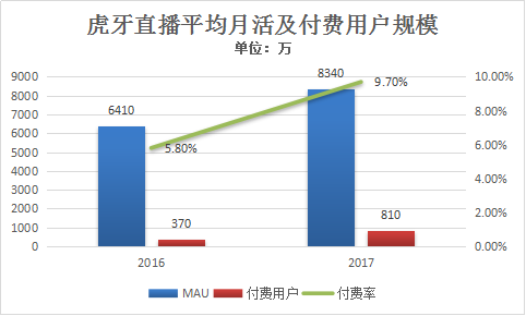 2017年,虎牙直播平台MAU为8340万,而2016年只有6410万。付费用户也从2016年的370万大幅度增长到810万,付费率也增长到9.7%。