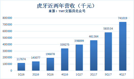 虎牙营收连续8个季度保持增长,2017年第四季度,虎牙实现营收7.4亿元。