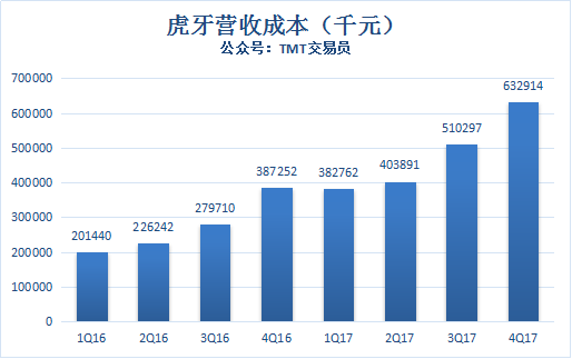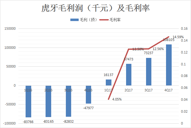 2017年第四季度,虎牙毛利润为1亿元,毛利率进一步提升到14.59%。