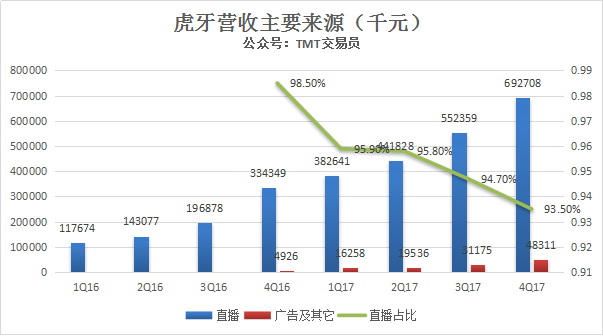 虎牙营收主要来自直播、广告及其它业务,直播收入是虎牙最主要的收入来源,但最近5个季度,直播收入占总营收比重轻微下滑。2017年第四季度,虎牙直播收入6.9亿元,占总营收的93.5%。