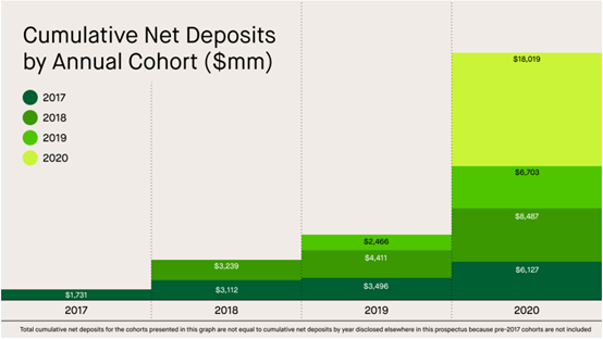 再横向对比Robinhood不同时间的用户及其累计入金情况,从下图可以看到,2020年的新客户累计入金数量比2017、2018和2019都多。2020年新冠爆发,美国政府和美联储天量放水,Robinhood 2020年新用户入金这么多,和当时美国的财政政策和货币政策有紧密的关系,也说明Robinhood就是散户集中营。