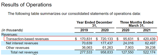 从Robinhood的收入构成来看,主要收入来源是交易相关收入和净利息收入,其中交易相关收入是大头,2020年交易相关收入占总收入75%,2021年一季度该比例提升至80.5%。既然Robinhood是0佣金的,那么这么多的交易相关收入什么呢?