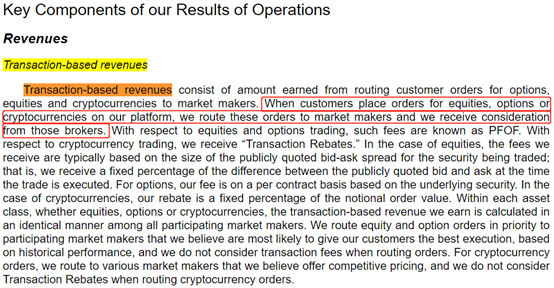 从招股书找到Robinhood的交易相关收入解释,可以看到Robinhood将用户的订单发送给做市商,并从做市商获得报酬。这种方式在业内被称为“Payment for order flow”或者“sell order flow”,卖订单流。