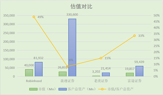 从下图可以看到,Robinhood的估值最高,市值/客户总资产达到49%,而盈透证券最低,只有8%。