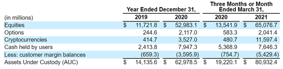 当然,发展路径可能不只有向机构客户发展,可能还能向区块链交易发展。Robinhood提供7种数字货币的交易,从Robinhood的AUC(Asset Under Custody托管资产)来看,数字货币的AUC体量增长快速,2020年数字货币的AUC为35.27亿美元,同比增长750.5%;2021年一季度数字货币的AUC增长至115.97亿美元,同比增长2312.6%%,甚至环比都增加了228.8%。2021年一季度数字货币的AUC体量已经发展成仅次于股票,Robinhood从数字货币交易中获得收入并不是通过卖订单流。