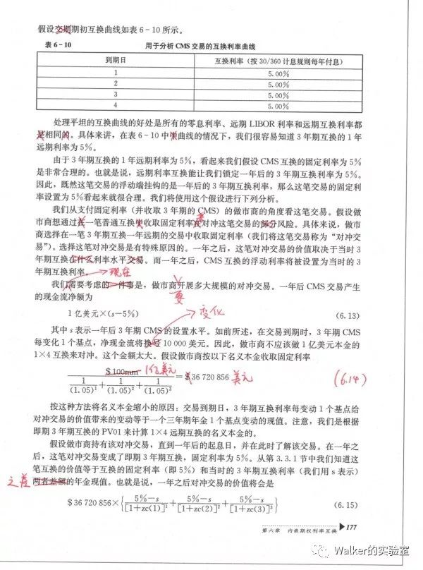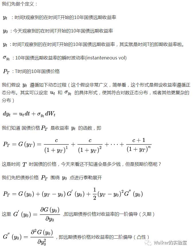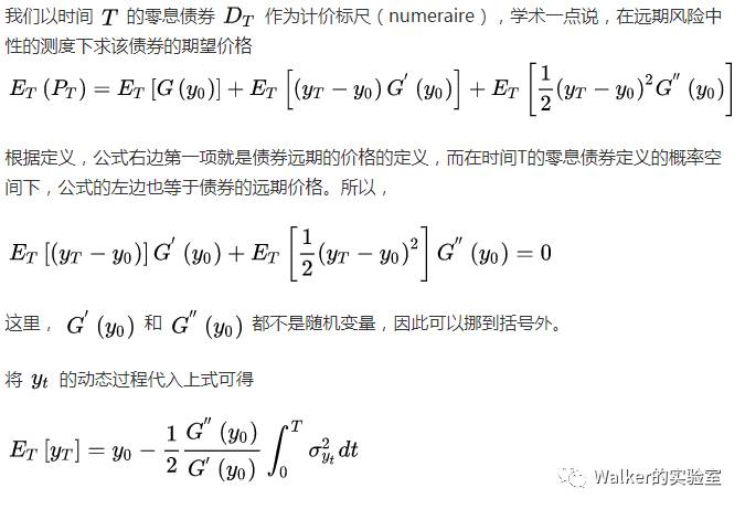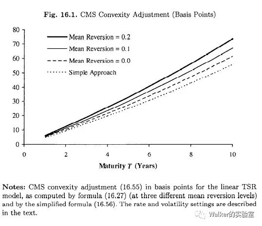 我们最后严格证明的期权价值就是等式右边第二项,它看起来竟然非常吻合我们开始给出的估算方式。这一项虽然是负号,但是债券的久期和凸性的符号相反,所以这是一项是正数,表明CMS的固定利率应该高于通过收益率曲线计算出来的10年国债远期收益率。并且幅度的大小与债券的凸性成正比,与收益率的总方差成正比。