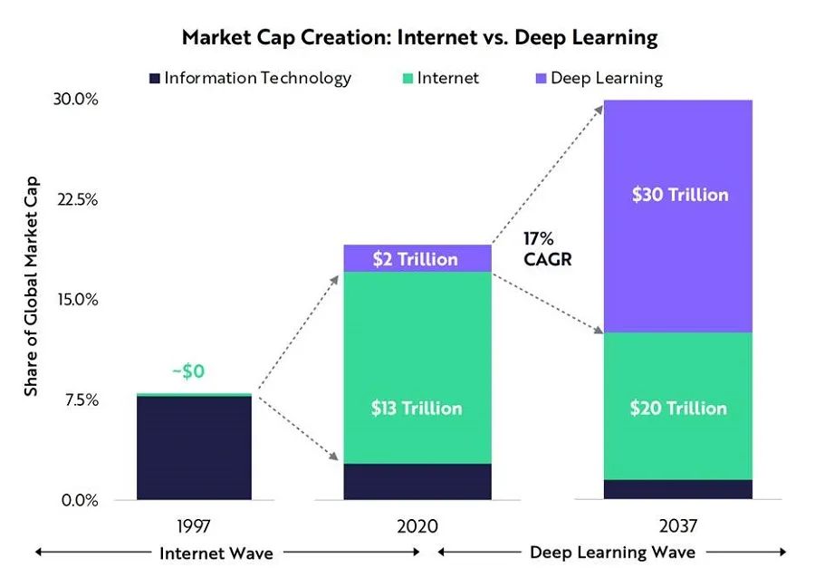 而现在人工智能时代已经逐步到来,据ARK Invest分析,到2037年人工智能产生的市值将会超过互联网市值的总和。
