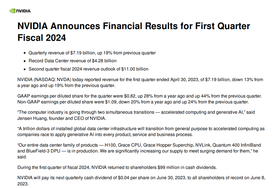 $英伟达(NVDA)$ 发布2024财年第一财季(下称一季报)的财报,令市场目瞪口呆的亮眼数据也引发盘后股价暴涨。