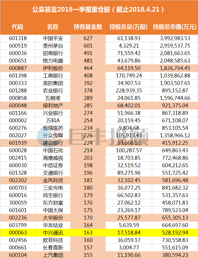 现在市场中有大量公募基金持有中兴通讯(000063)的股票。以下是截止2018年4月21日已经披露一季报的基金的持仓,我以持有基金数为标准选取了前30只股票。