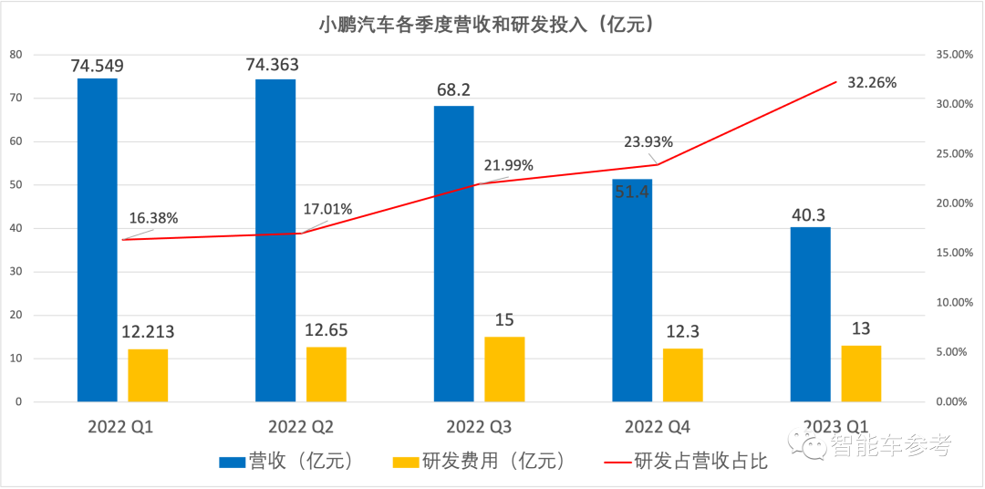 2023年Q1,研发支出13亿元,占营收的32.26%,技术不变,但占营收总额比例大幅上升。