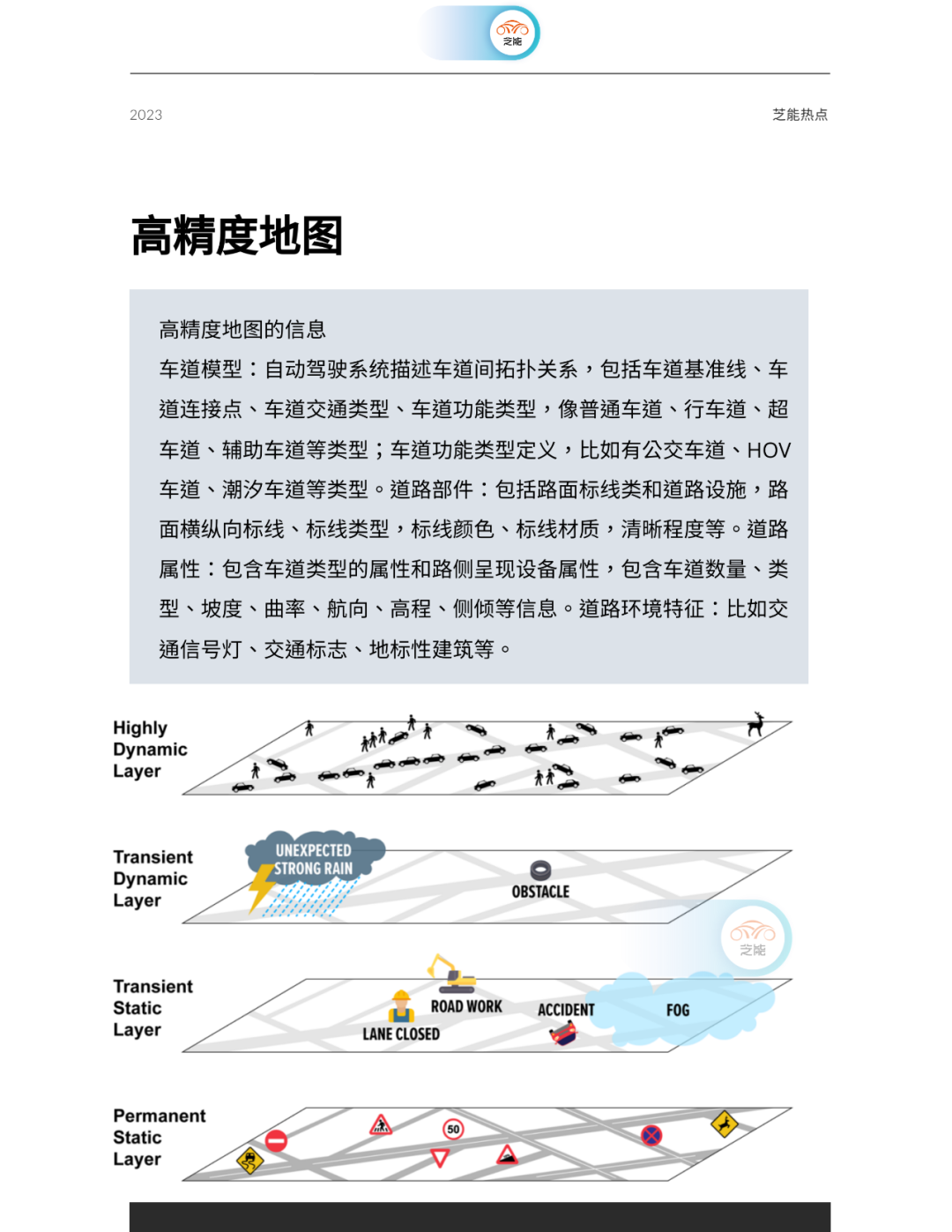 高精度地图是一种精度可达厘米级的电子地图,相比之下,传统电子导航地图精度为米级。高精度地图包含了更多的信息: