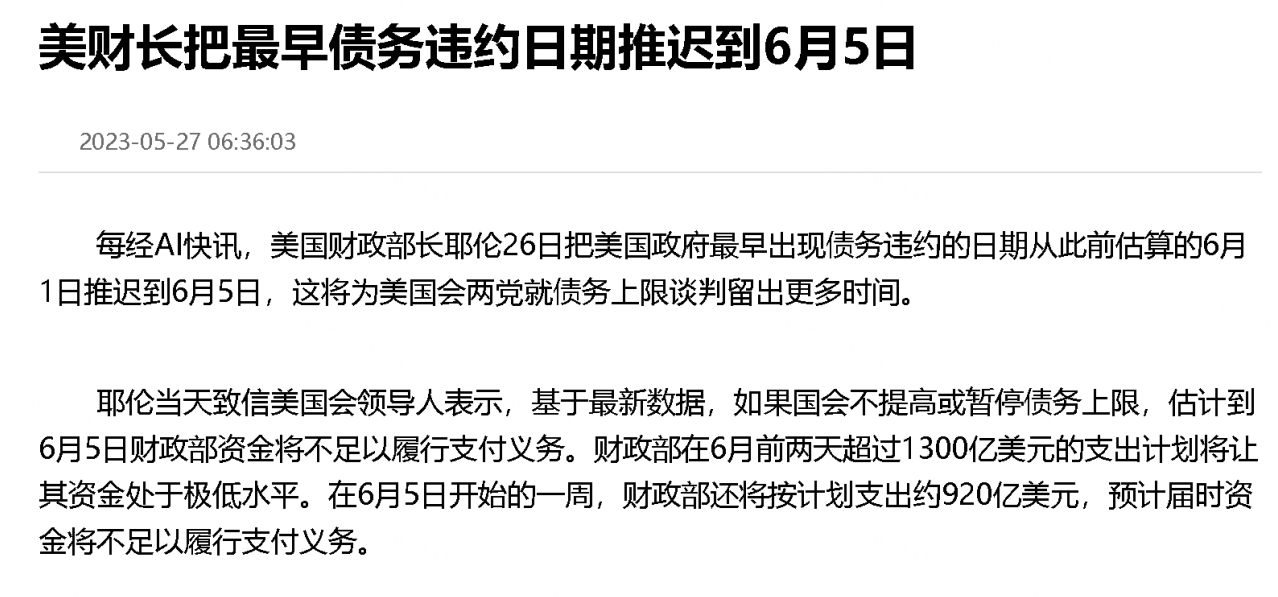 周末,债务上限协议在极限拉扯数周后终于出炉,下周将迎来参众两院的审议通过。只要通过了,现阶段的债务上限“闹剧”将消停一段时间,两年后,或者具体说明年大选出炉后,就再折腾一遍。不断拖后的风险,就让后人折腾去,起码当下不爆雷就行。