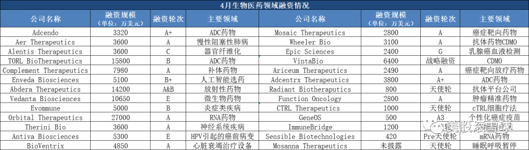 抗体偶联药物(ADC)公司领域:ADC是4月融资事件最多的领域,共有4家公司完成融资:TORL BioTherapeutics、Alentis、Adcentrx、Adcendo,这也是当下最火爆的Biotech细分领域之一,阿斯利康、辉瑞等大药企的合作与并购也发生在该领域;