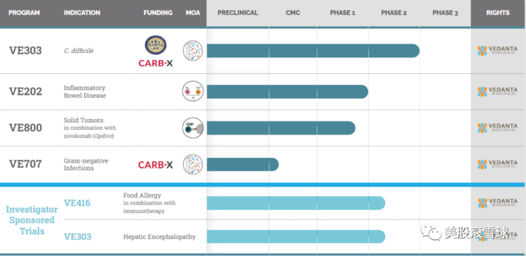 VE303:一种口服活体生物药,由8株经过筛选鉴定后的肠道共生菌组成,能够抑制肠道致病菌的定植,目前准备开展预防复发性艰难梭菌感染的3期临床试验;