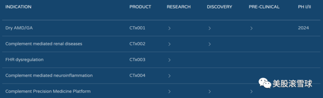 基于对FHR蛋白作用机制的理解,Complement 将补体疗法延伸到其他领域,开发了针对肾脏疾病的CTx002、胎心失调的CTx003、神经炎症的CTx004等多个药物。