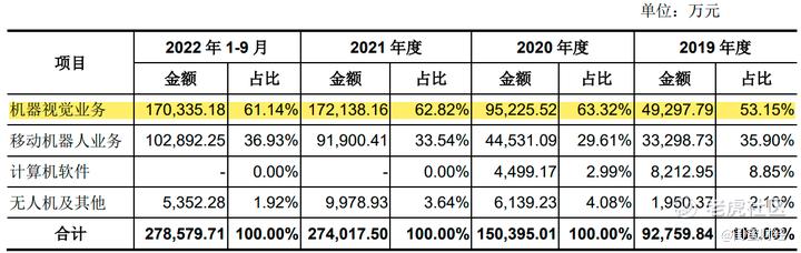 据招股书披露,海康机器人2019—2021年及2022年前9个月,其主营业务中,机器视觉的占比最高,在53%—64%之间;移动机器人业务占比次之,在29%—37%之间。