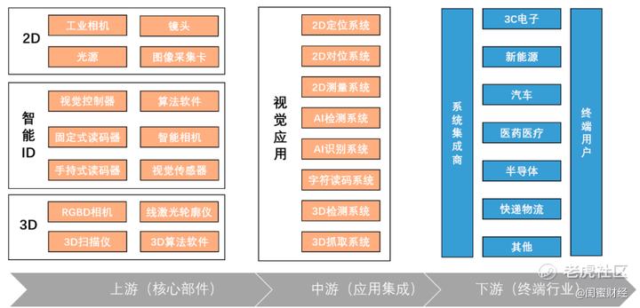 海康机器人的机器人视觉业务处于产业链中上游。主要是专注于底层算法软件和硬件技术,拥有机器视觉技术栈,为客户提供机器视觉产品和算法软件平台。其产品类别覆盖2D视觉、智能ID和3D视觉等。