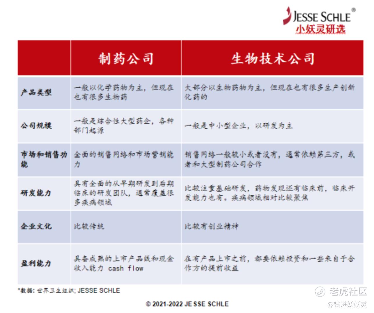 生物技术公司(Biotechs)现在一般会指那些风险接受度更高的一些公司,他们注重研发,尤其是一些初创型的生物技术公司,更加依赖颠覆性的生物科技发现去研发药物,所以失败的风险也更大。很多生物技术公司不会花钱去建立超级牛x的市场和销售团队,他们把更多的人力和财力放在研发方面。与之对应的,大型制药公司一般都有很庞大的销售团队和完善的甚至能够覆盖全球的销售网络。