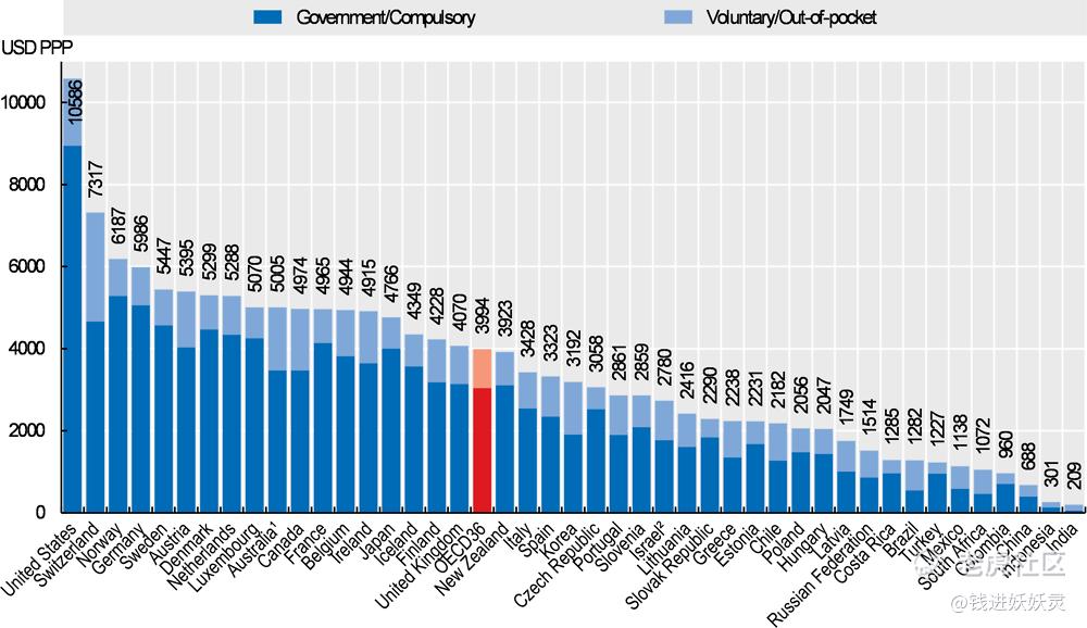 数据:OECD Health Statistics 2019, WHO Global Health Expenditure Database.