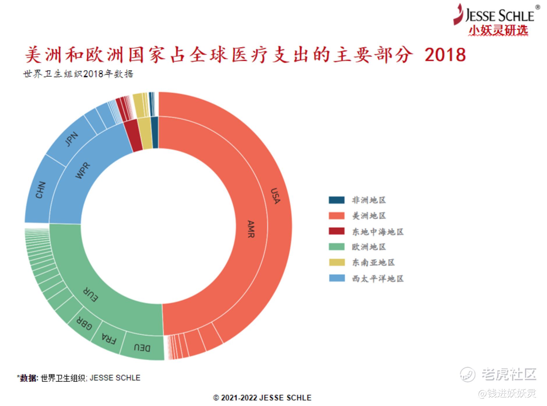 世界卫生组织2020年的世界医疗支出报告显示,2000年到2018年间,全球在医疗方面的花费持续增长,达到了8.3万亿美元的量级,而这个数据约占全球GDP的10%。而如下图所示,大部分的医疗支出是由美国和欧洲地区贡献的。