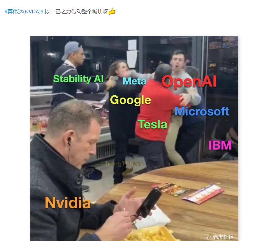 虎友祭出这张表情包,生动形象地显示出各家科技公司火热布局 AI的情景,而英伟达作为“卖铲人”淡定坐在一边,岁月静好等待身价暴涨。 $Meta Platforms(META)$ $谷歌(GOOG)$