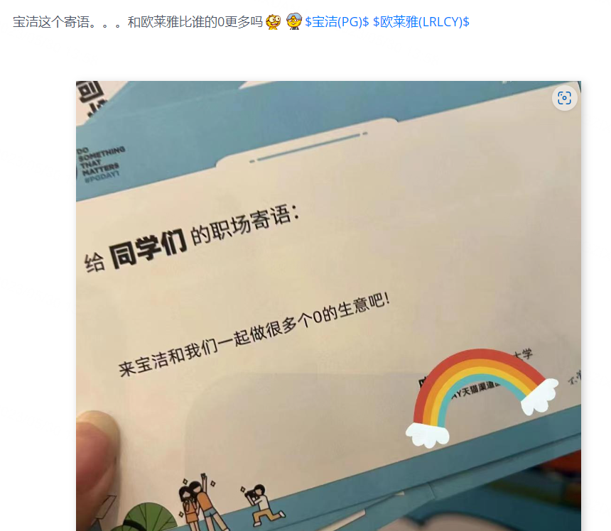 争议宣传语当然不止美团一家有,有虎友发现了 $宝洁(PG)$ 这个寄语,不能深想呀不能深想: