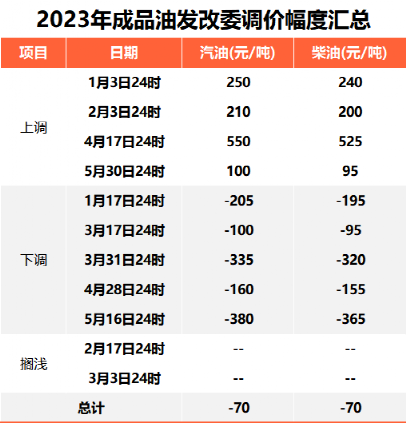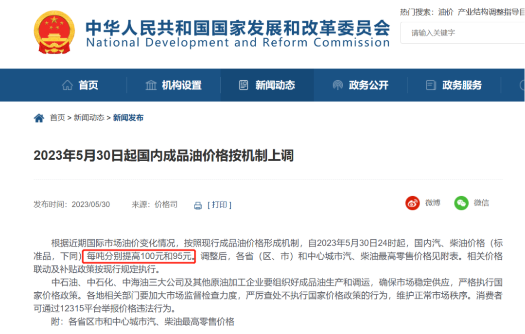 根据近期国际市场油价变化情况,按照现行成品油价格形成机制,自2023年5月30日24时起,国内汽、柴油价格(标准品,下同)每吨分别提高100元和95元。