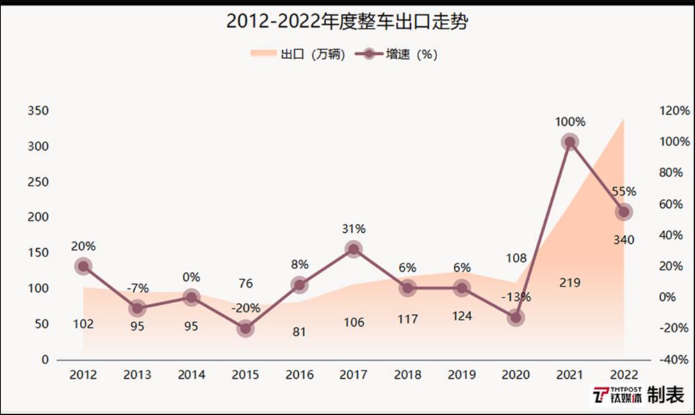回顾中国汽车出口之路,2001年,中国汽车迎来第一次批量出口,目的地是叙利亚;2002年刚加入世界贸易组织(WTO)时,全年汽车出口仅有2.2万辆;此后十年,中国汽车出口首次超过百万辆(106万辆),随后多年仍徘徊在100万辆左右的水平。