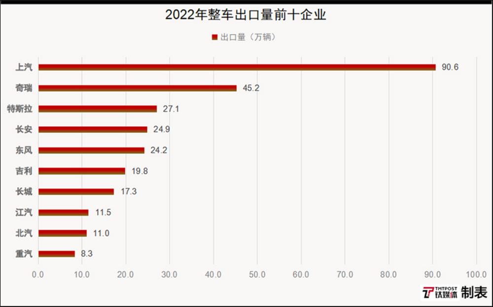 根据中汽协数据显示,2022年中国汽车出口的领军企业当属上汽、奇瑞和特斯拉。从具体的出口量来看,上汽成为中国汽车出口当之无愧的霸主,全年出口达90.6万辆;奇瑞以45.2万辆的成绩位列第二;而第三名才是特斯拉的27.1万辆。