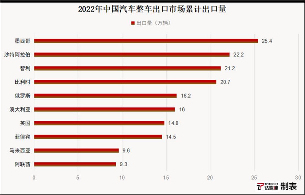 与之形成鲜明对比的则是,今年一季度,中国汽车商品出口金额排名前十的国家依次是俄罗斯、美国、墨西哥、英国、比利时、日本、澳大利亚、德国、阿联酋和韩国。这十个国家汽车商品累计出口金额227.4亿美元,占全部汽车商品出口总额的48.5%。