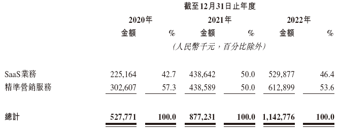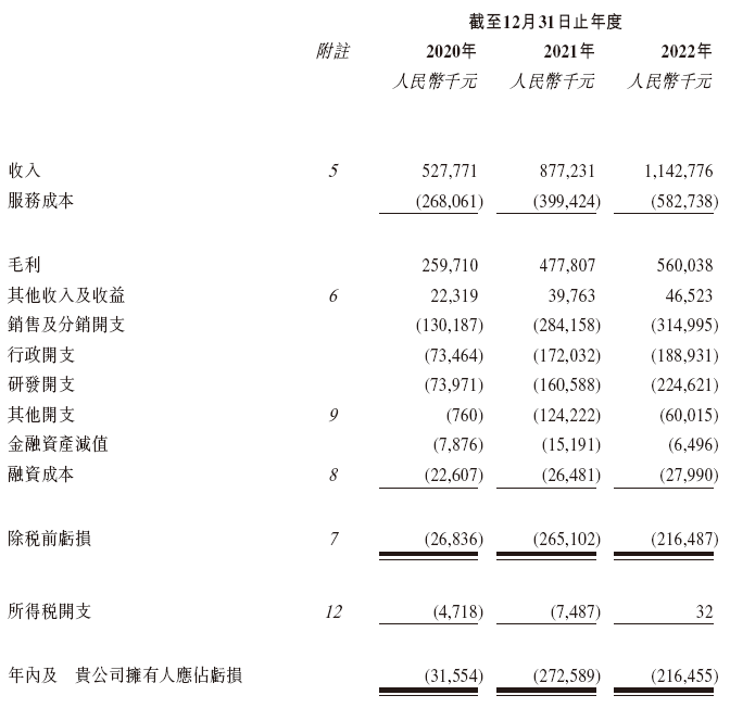 招股书显示,在过去的2020年、2021年和2022年三个财政年度,迈富时管理的营业收入分别为人民币5.28亿、8.77亿和11.43亿元,相应的净亏损分别为人民币0.32亿、2.73亿和2.16亿元。