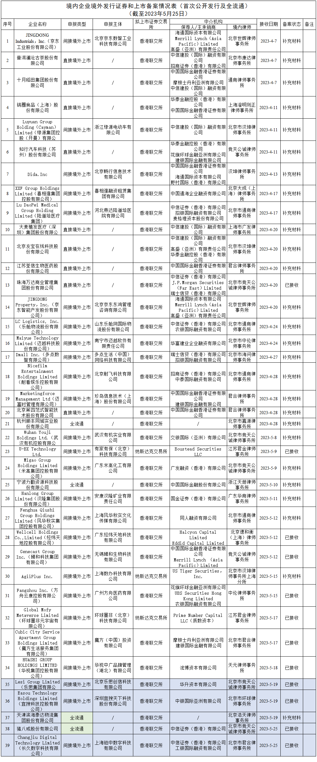 境内企业境外发行证券和上市备案情况(2023年5月25日)