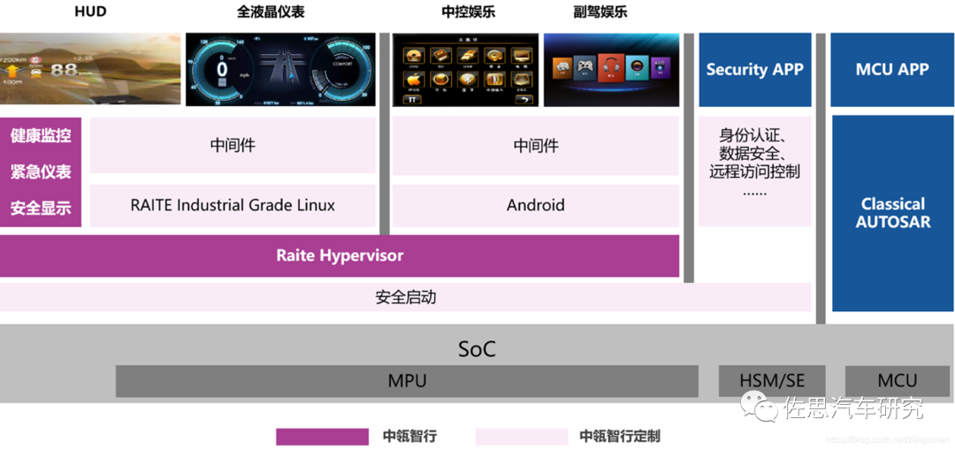 在嵌入式虚拟化技术方面,国外的 QNX、OpenSynergy、PikeOS 等有先发优势,尤其在汽车领域已耕耘多年的QNX,在这两年涌现了较多的QNX应用案例。随着KVM和VirtIO的出现,虚拟机门槛大大降低,国内这几年也出现了不少芯片厂商、独立软件厂商研发嵌入式虚拟化技术、产品、解决方案,如中瓴智行的 RAITE Hypervisor(RHOS)、中兴 GoldenOS、斑马智行的 AliOS Hypervisor、中汽创智 CAIC Hypervisor 等。国产化方案芯驰 X9HP+ 平台,采用硬分区、Hypervisor 两种方案灵活配置实现中低端智能座舱域控制器产品。