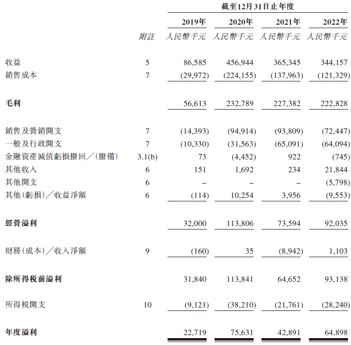 业绩方面,2019年、2020年、2021年和2022年,巨星传奇的营业收入分别为0.87亿、4.57亿、3.65亿和3.44亿元,同期净利润分别为2,271.9万、7,563.1万、4,289.1万和6,489.8万元,同期经调整净利润分别为2,271.9万、8,036.4万、6,993.3万和7,717.3万元。
