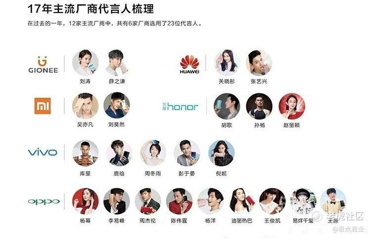 比如,2017年OPPO携手浙江卫视举办了一场OPPO R11新品发布会,周杰伦、孙燕姿、李宇春、蔡依林、陈伟霆、林忆莲、林俊杰、迪玛希、李易峰、王俊凯、张一山、陈赫、郑恺等17位明星亮相,号称“半个娱乐圈”明星都来助阵。当年vivo X20发布时,也签约鹿晗、周冬雨和彭于晏成为代言人。