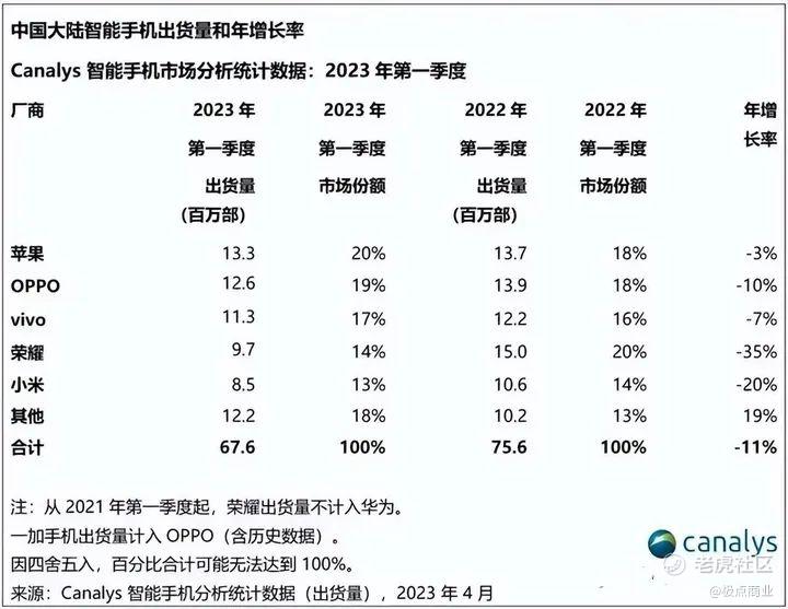 Canalys数据显示,2023年一季度荣耀出货量970万部,市场份额14%排名第四,相比去年同期同比下滑35%,降幅远超排名前五其他品牌;Counterpoint Research数据则显示,荣耀一季度市场份额为14.6%,同比下降18%,远超小米、OPPO、vivo下滑速度;IDC数据也称,荣耀一季度市场份额同比降幅为22.8%。