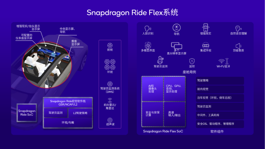 高通的破局方式很简单,从安身立命的座舱、连接入手,向“舱驾一体”或者是“舱驾联动”进击,“flex”这个单词意思是“灵活多变”,指的就是座舱主芯片+智能驾驶加速芯片这种润物细无声的搭配。
